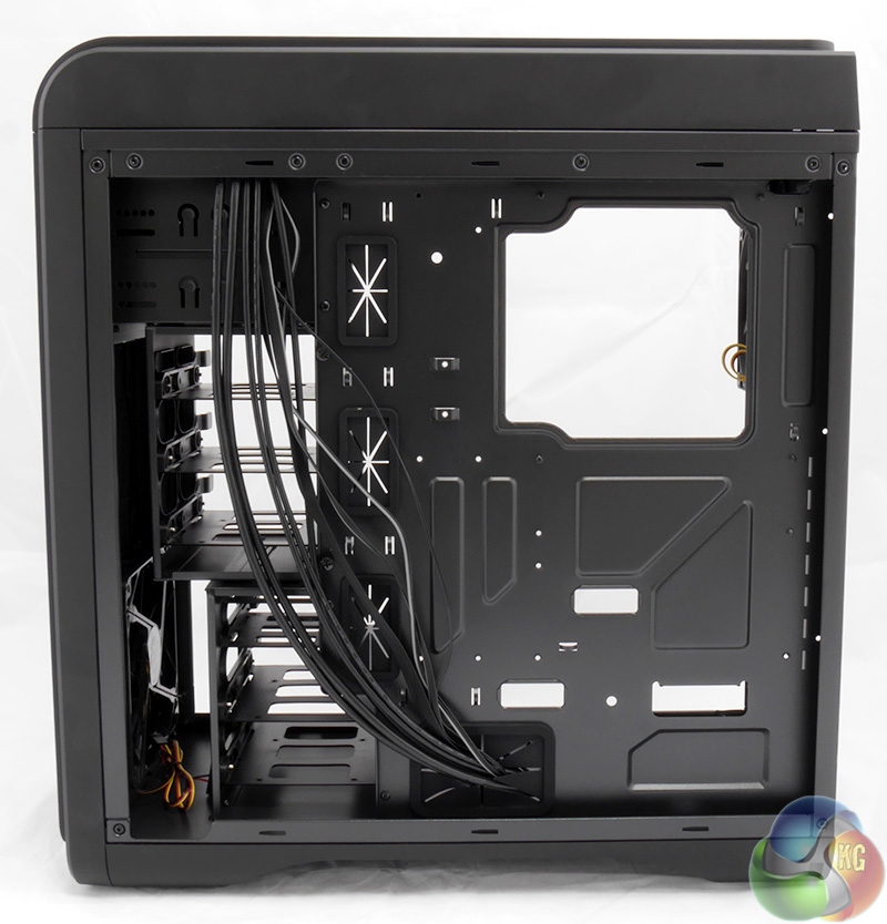 There is a large opening in the motherboard tray that gives access to the mounts for the CPU cooler. At the front of the case the drive towers are arranged in a staggered pile with two 3.5-inch/2.5-inch bays at the bottom, two 2.5-inch bays above and then another three 3.5-inch/2.5-inch bays.