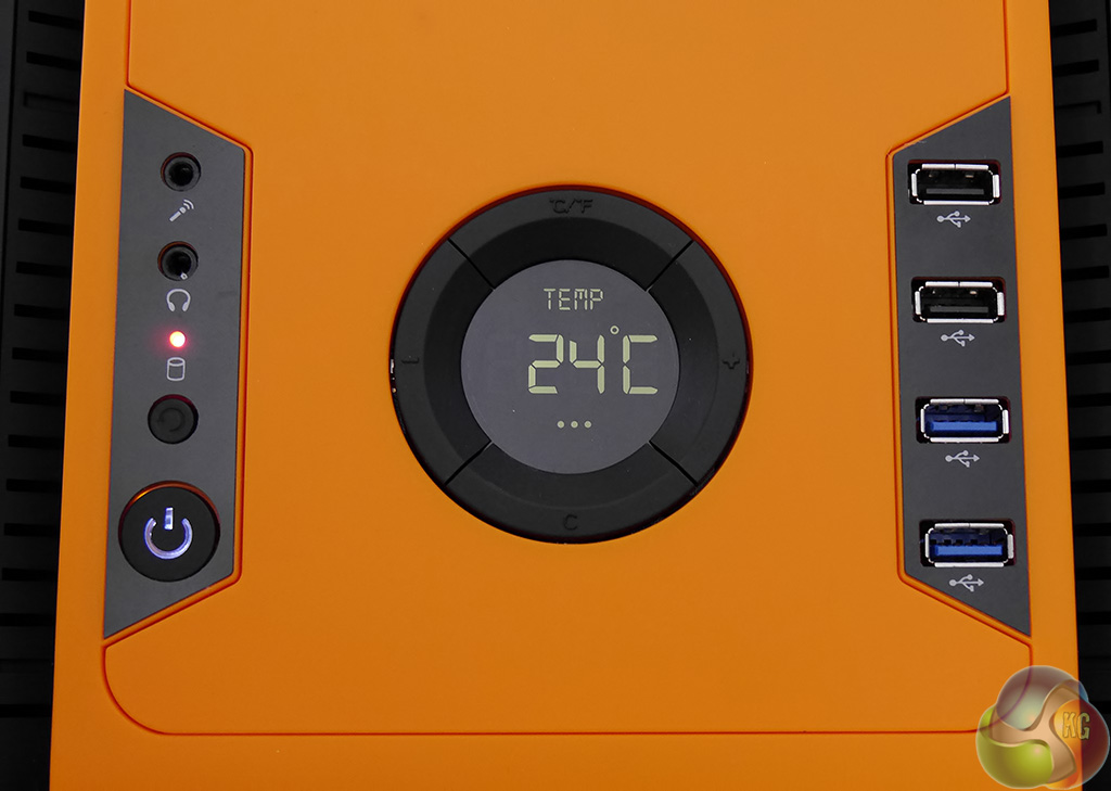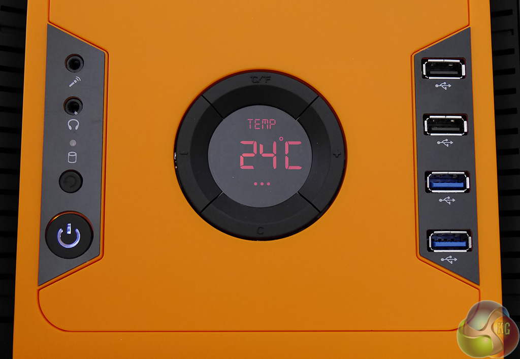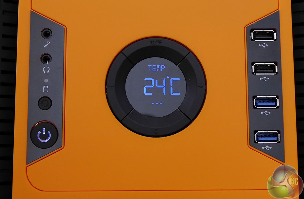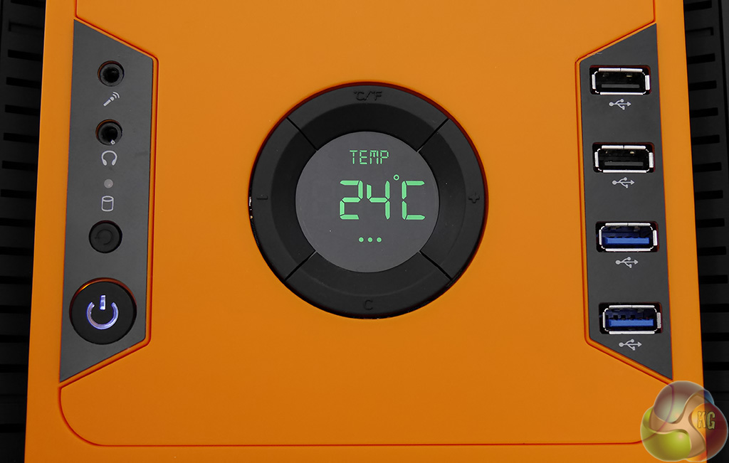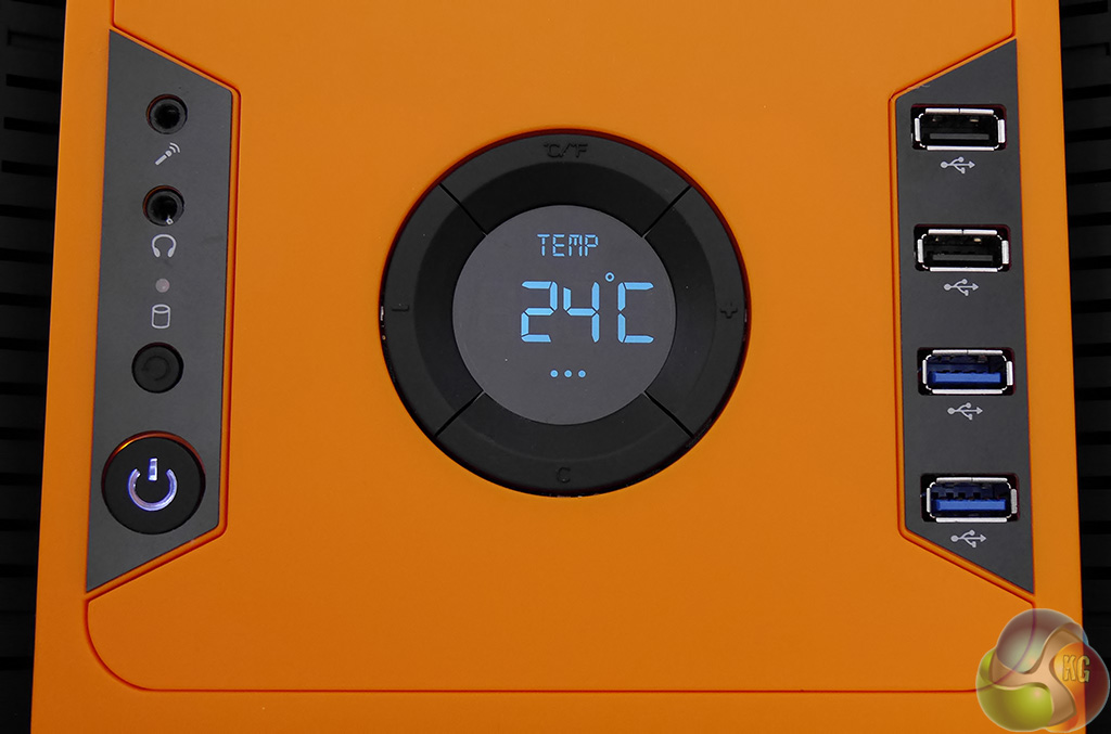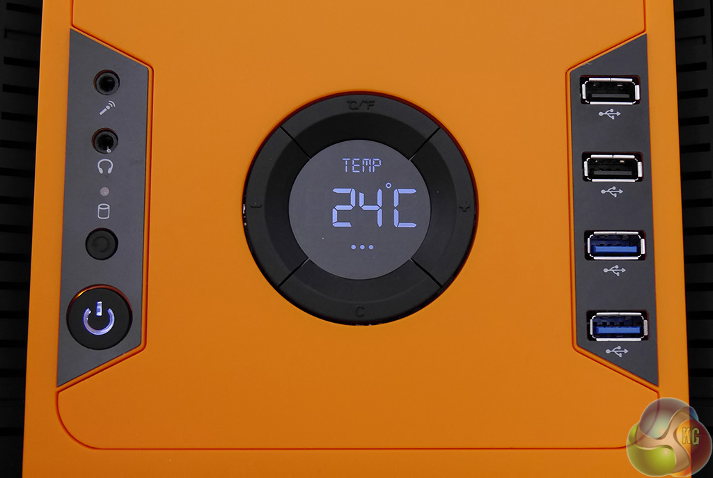 You use the four buttons to switch between degrees C and F, to change the colour of the display and to control the speed of the fans inside the case. You”ll see more of that feature when we get inside the case.