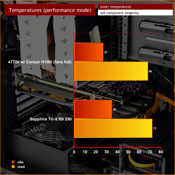 With the Noctua air cooler in place and the fan speed turned down low to keep the system as quiet as possible I found the Aerocool helped achieve decent results. The Core i7-4770K temperature rose by 50 degrees under load, however it is important to note that this is using synthetic benchmarks placing an unholy load on processor and graphics card. The GPU temperature rose by 40 degrees which is a touch higher than I like to see and probably reflects the relatively cramped nature of the case as there isn't a great deal of space for air to flow.