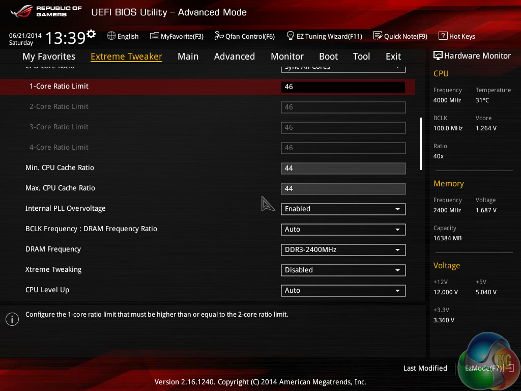 The settings that we used for our quick-and-easy overclock consisted of: 1.30V VCore (peaked at 1.328V under load), 1.275V Cache voltage, 1.90V Input voltage, and ‘auto‘ load-line calibration. XMP was enabled, as was PLL overvoltage, and the cache ratio was maintained at 44x.