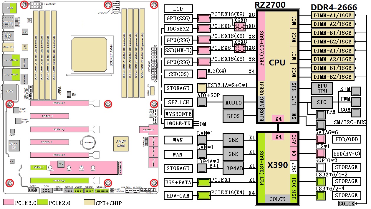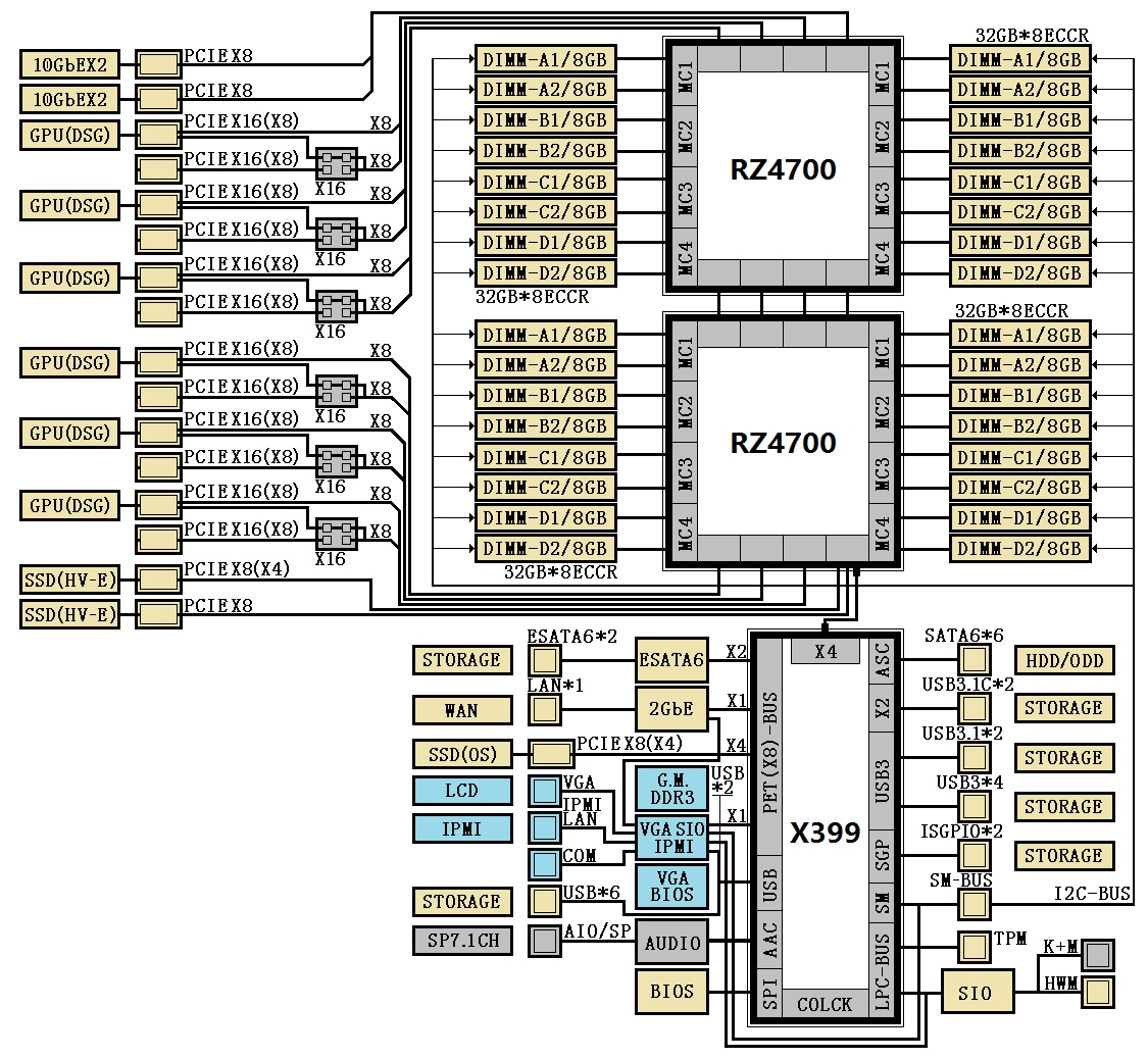 The single-socket SP3r2 implementation for RZ2700 differs from its presumed big brother, providing higher integration of features and fusing a lot of the southbridge functionality into the CPU package. For example, the RZ2700 will sport a quad memory controller, addressing what seems to be a maximum 256GB of ECC DDR4-2666, but also include the USB 3.1 controller (3.1C x1, 3.1A x2), some standard I/O, TPU, EPU, I2C bus controller and integrated 7.1 channel audio. It drives a total of 48 PCIe lanes, four of which are reserved for the chipset interconnect, and the remainder 44 lanes distributed among a myriad of features like dual 10GbE, M.2 connector (for an OS SSD), and PCIe slots galore for solid state graphics or more storage.