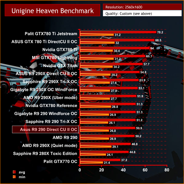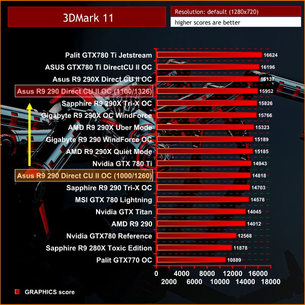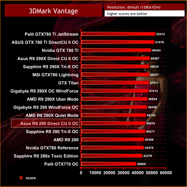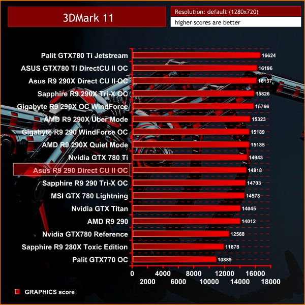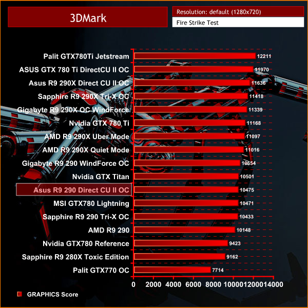 The Asus R9 290 Direct CU II OC scores well, only around 100 points behind the reference clocked GTX780 Ti.