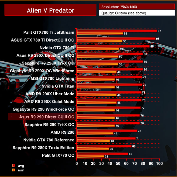 The Asus R9 290 Direct CU II OC is very closely matched against the reference clocked GTX Titan, scoring 10,475 points.Aliens V Predator has proved to be a big seller since the release and Sega have taken the franchise into new territory after taking it from Sierra. AVP is a Direct X 11 supported title and delivers not only advanced shadow rendering but high quality tessellation for the cards on test today. To test the cards we used a 2560×1600 resolution with DX11, Texture Quality Very High, MSAA Samples 1, 16 af, ambient occlusion on, shadow complexity high, motion blur on.