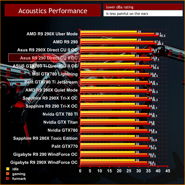 The dual fan Direct CU II isn't the quietest cooler we have experienced, spinning up significantly when under load. It is identical to the 290X version which we tested several weeks ago.