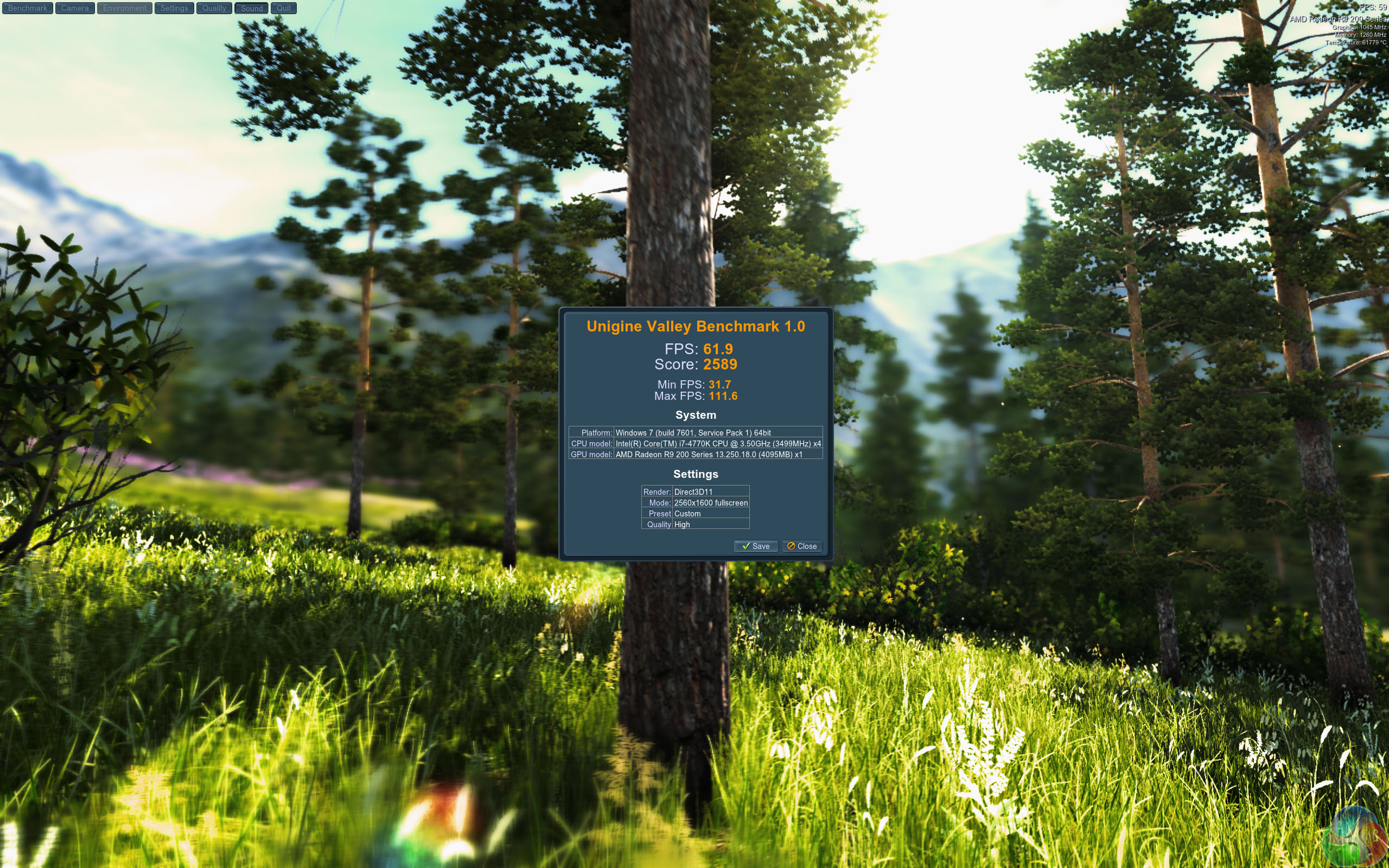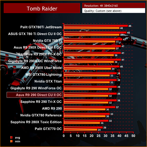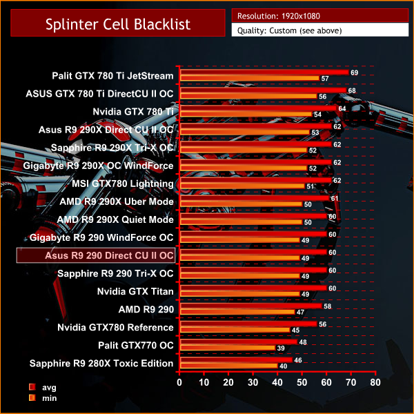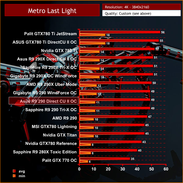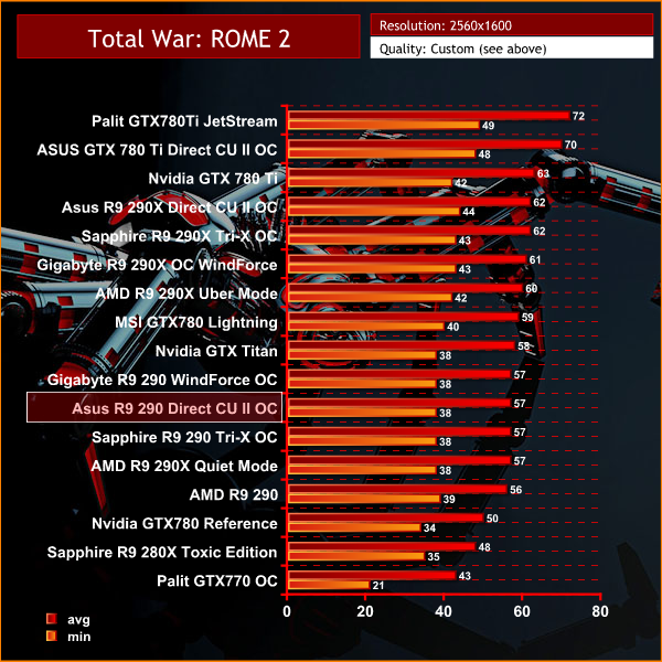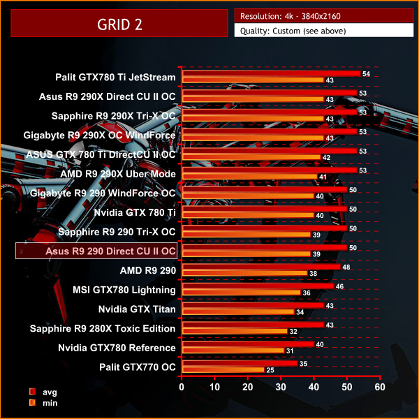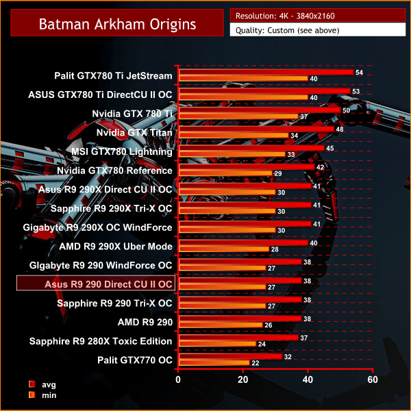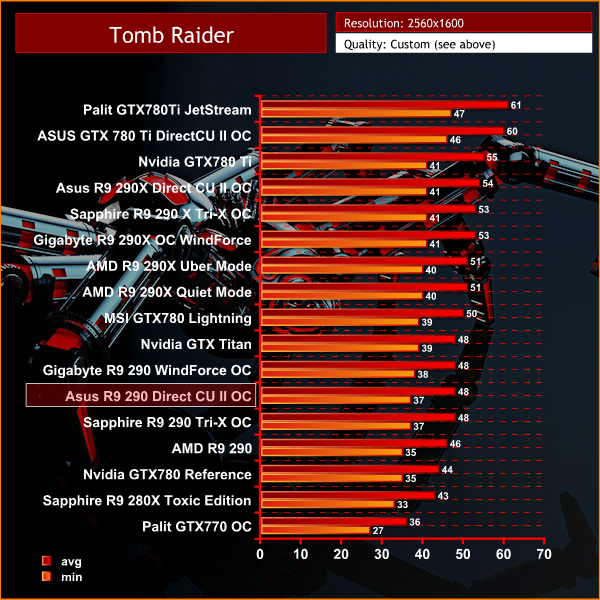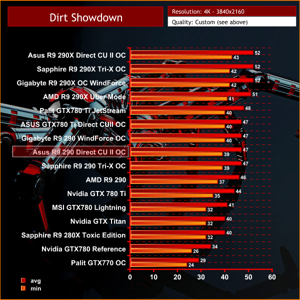 The Asus R9 290 Direct CU II OC scores well in this benchmark, averaging almost 62 frames per second.