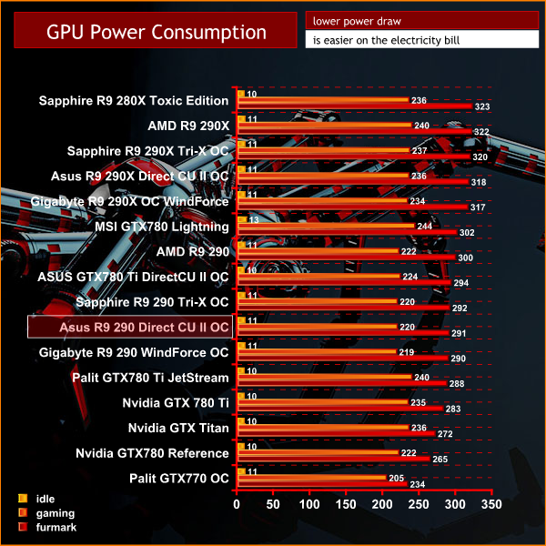 Power consumption falls in line with other overclocked 290 solutions we have tested in recent months.