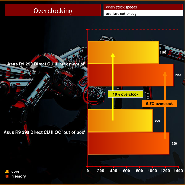 While we mentioned some high VRM temperatures on the thermal dynamics page of our review, we didn't experience any instability during testing, and we were able to overclock the core on this card by 10%, to 1,100mhz. We had to raise the default fan settings a little to help with cooling, but the Asus R9 290 Direct CU II OC did overclock to the same levels as both Sapphire and Gigabyte solutions. ASUS did explain the (supposed) high VRM temperatures and you can read this on the Thermal Dynamics page in this review.