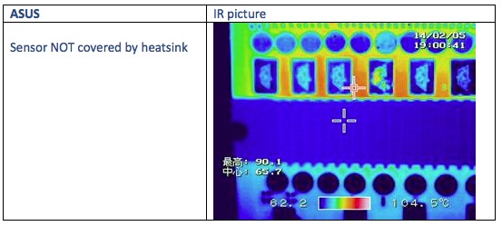 We spoke to ASUS about this just before going to publication and their engineering team said that the placement of the VRM sensor is in a different location on their 290's, but the VRM's are being cooled well within specifications.