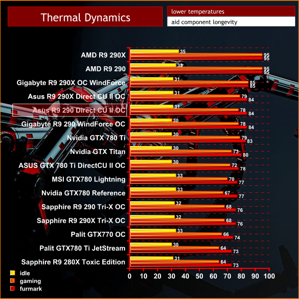 The Asus R9 290 Direct CU II OC peaks at 84c under Furmark load, and 78c when gaming.