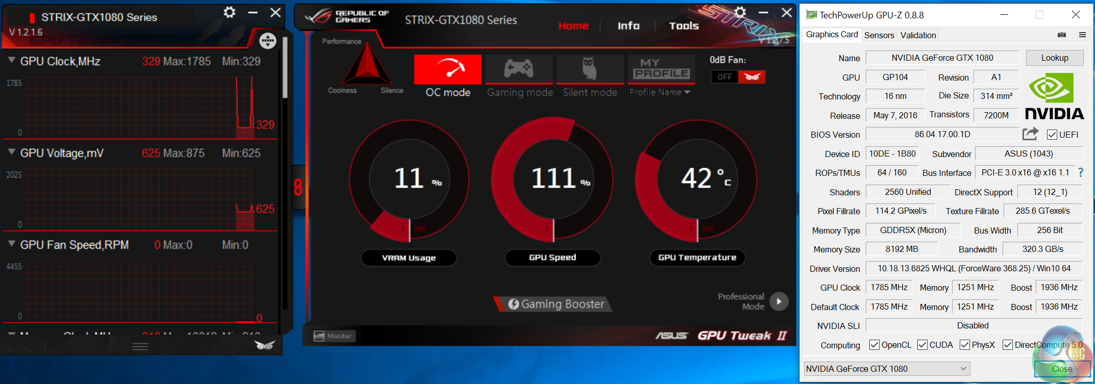 The Asus Republic Of Gamers Strix GTX 1080 can operate at different clock speeds, controllable in the latest version of GPU Tweak II. In Gaming Mode base clock is set at 1759mhz, and in OC mode base clock is 1784mhz. Boost clock speeds are 1898mhz in Gaming mode and 1936mhz in OC mode. We test the card today in the faster OC mode, as it seems likely the enthusiast user base will do the same.