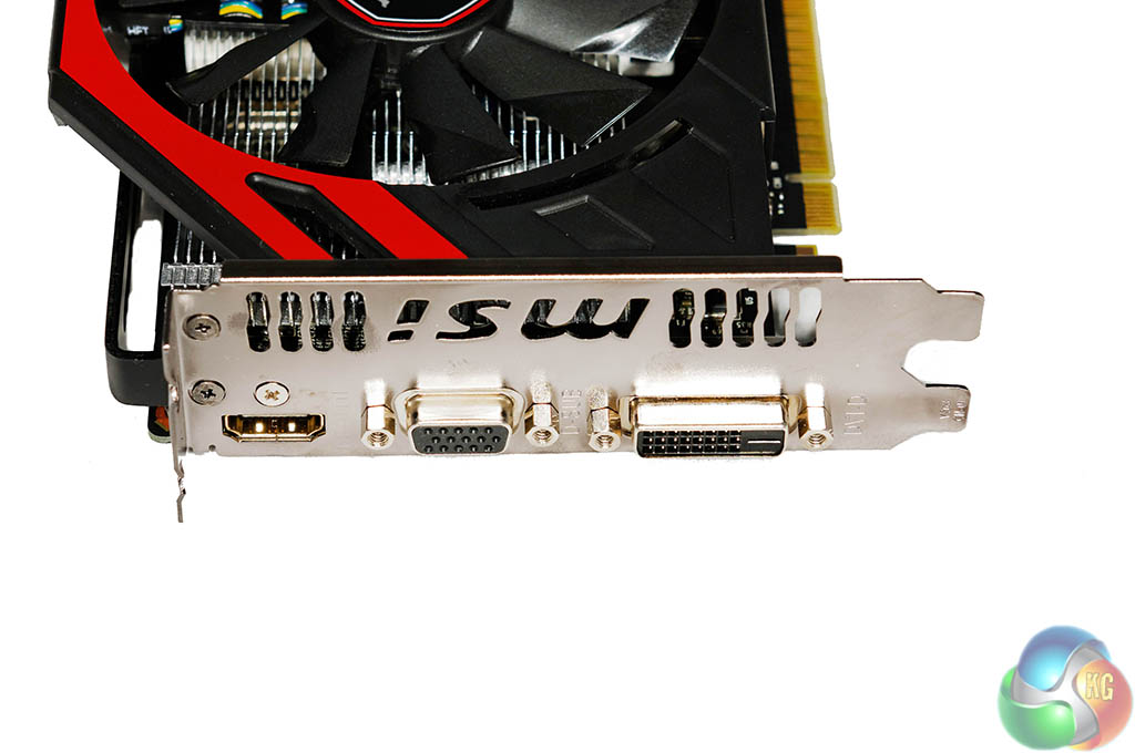 MSI GTX750 TI OC Twin Frozr connectivity, above. I have to admit I was shocked to see a VGA port on the back of a new GPU released in 2014 by MSI. Alongside is a HDMI port and dual link DVI connector, much more useful.