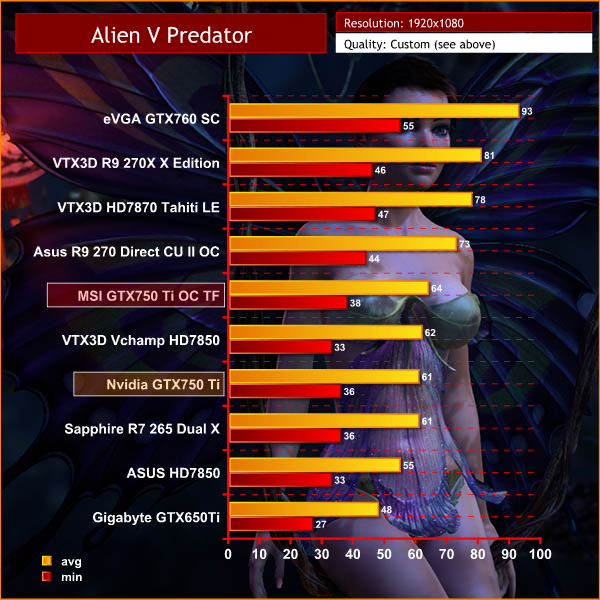 Noticeable improvements over the last generation Nvidia GTX650Ti, but still a way behind the HD7850.