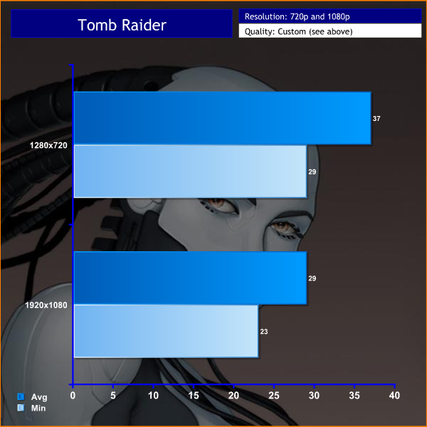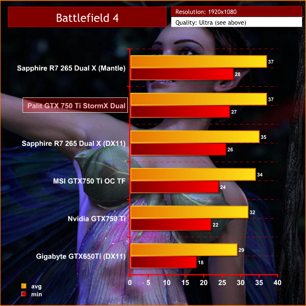 A good showing from the overclocked MSI GTX750Ti solution, averaging 34 frames per second – just a single frame per second behind the Sapphire R7 265 Dual X.