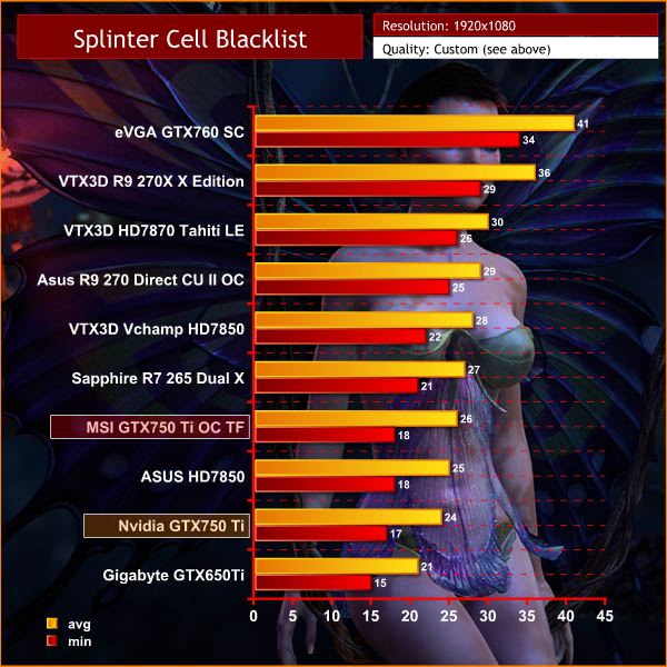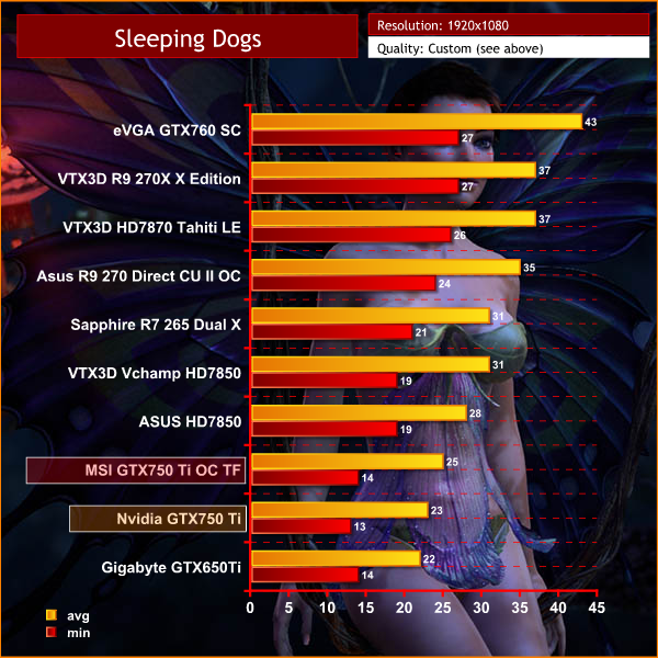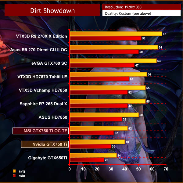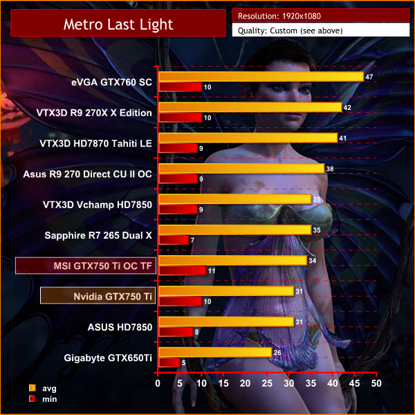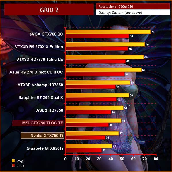 The reference clocked GTX750 Ti falls a little behind the Sapphire R7 265 Dual X, although the faster MSI GTX750 Ti OC is 2 full frames per second faster at these settings.