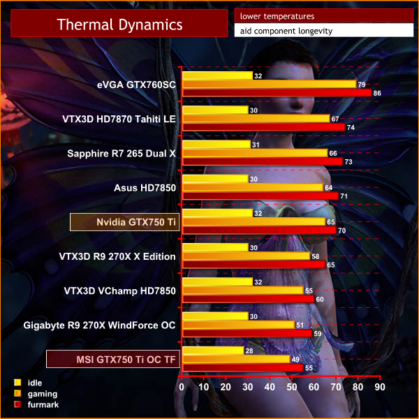 The MSI GTX750Ti Twin Frozr cooler is fantastic, and is the best performer we have tested in some time. It obviously helps that the Nvidia GM107 core runs very cool.