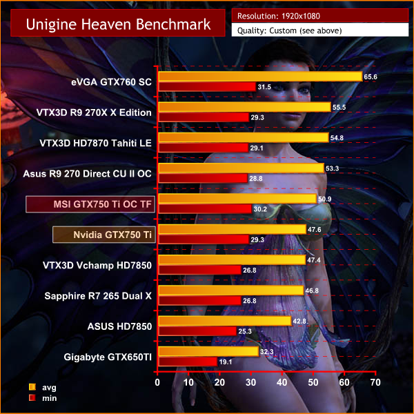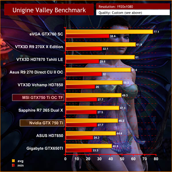 We can see a significant improvement over the GTX650Ti from the last generation, although both reference and overclocked MSI board fall a little short of the Sapphire R7 265 Dual X.