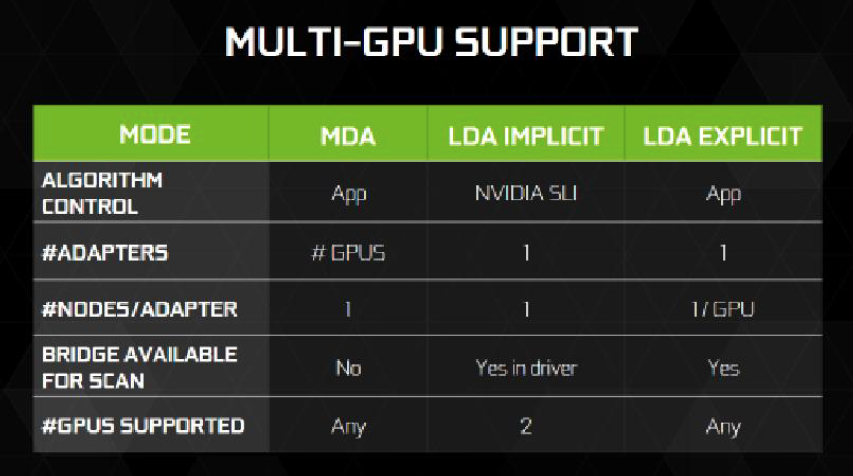 LDA Mode has two forms: Implicit LDA Mode which Nvidia uses for SLI and Explicit LDA Mode which allows game developers to handle much of the responsibility for multi GPU operations. MDA and LDA Explicit Mode was created to help give game developers more control over the game engine as well as multi GPU performance.