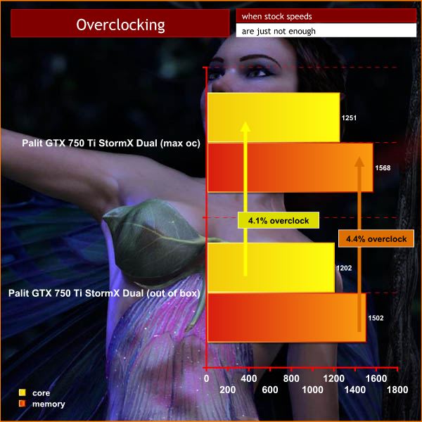 The Palit GTX750 Ti StormX Dual is already heavily overclocked, but there is around another 4 percent core headroom available via Afterburner.
