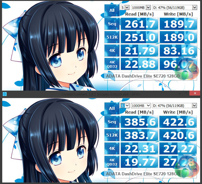 We went back and tried a different version of CrystalDiskMark and this time we tested with both default ‘incompressible data' (top image) and 0x00 ‘compressible data' (bottom image) patterns. This allowed the clever electronics inside the SE720 to process/compress data in the same way as the ATTO test and we got a similar patterns to the results.