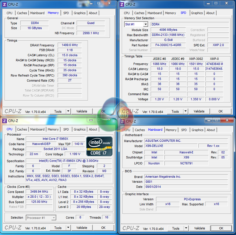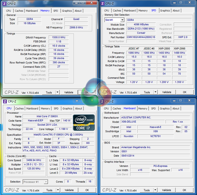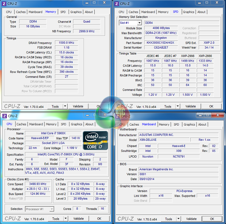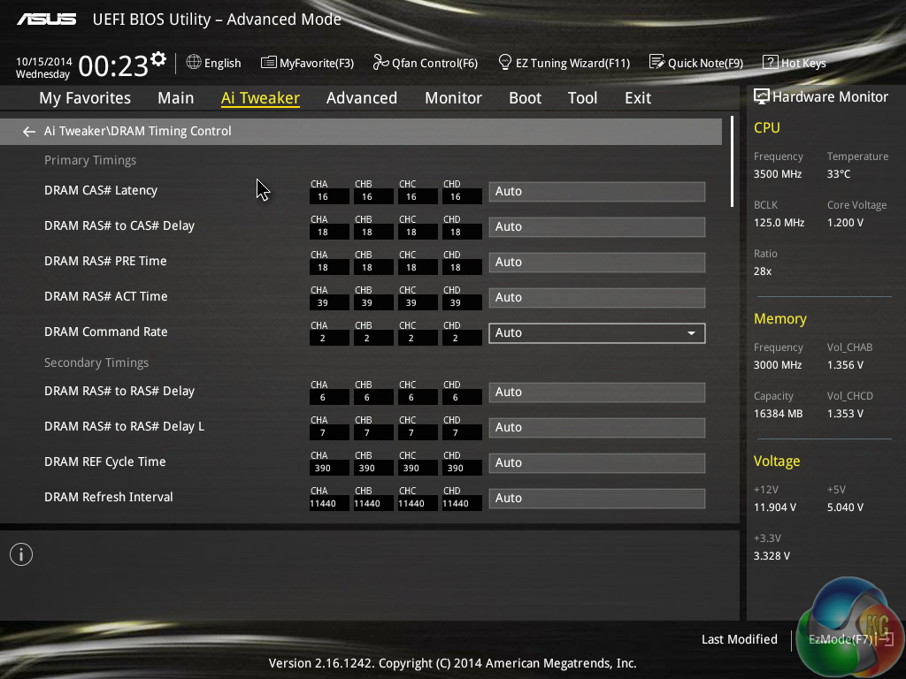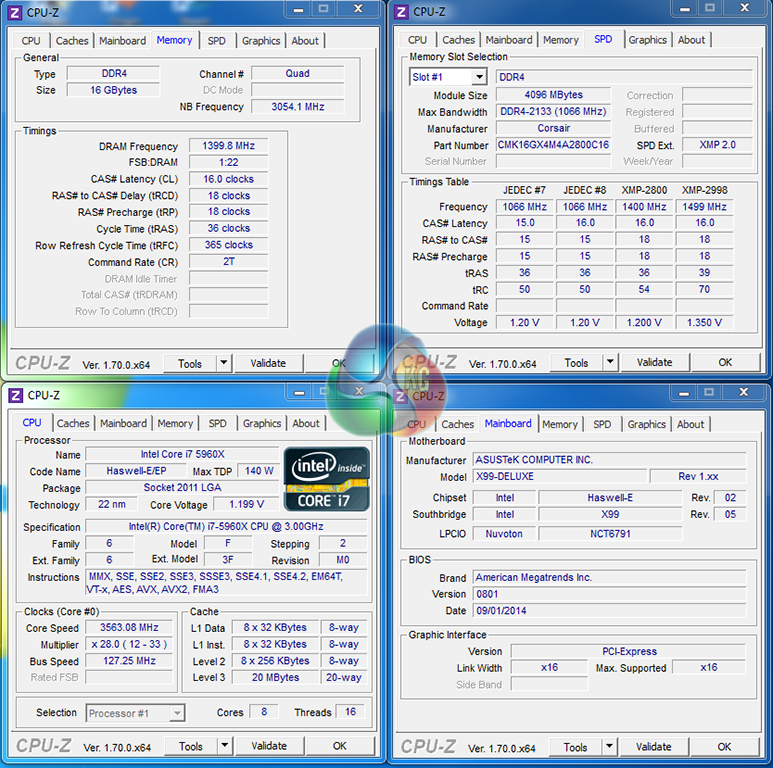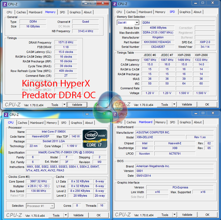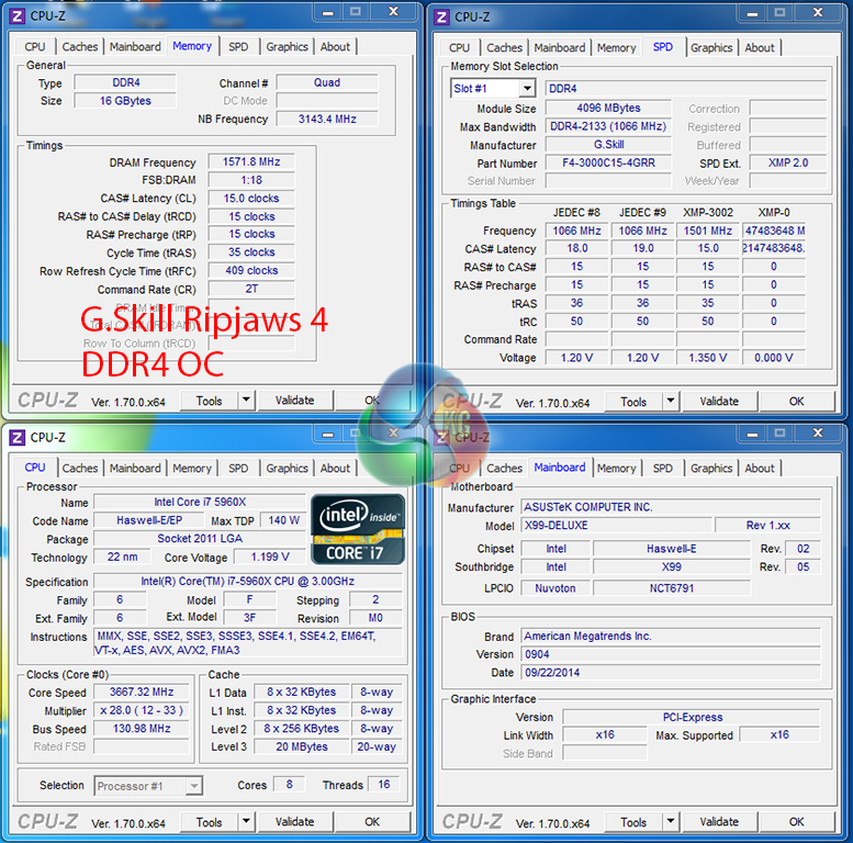 Our testing is conducted using an Intel Core i7 5960X processor on an Asus X99 Deluxe motherboard. Each memory kit is set to run at its 3GHz XMP configuration.