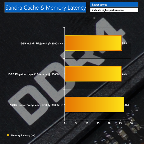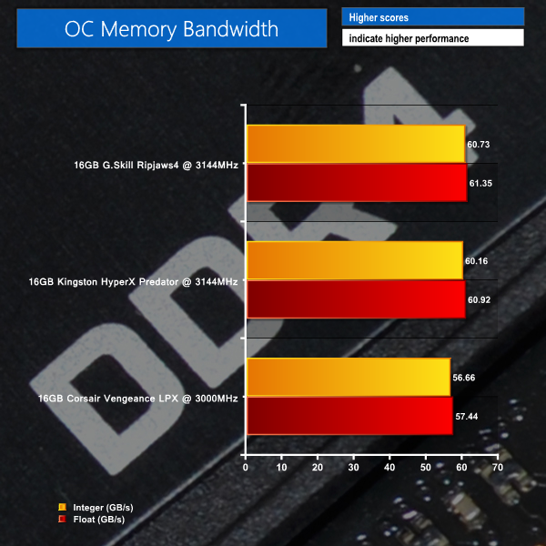Kingston's very similar HyperX Predator kit is very close to the G.Skill set in terms of memory bandwidth, while the looser timings of Corsair's Vengeance LPX modules hurt their latency score.