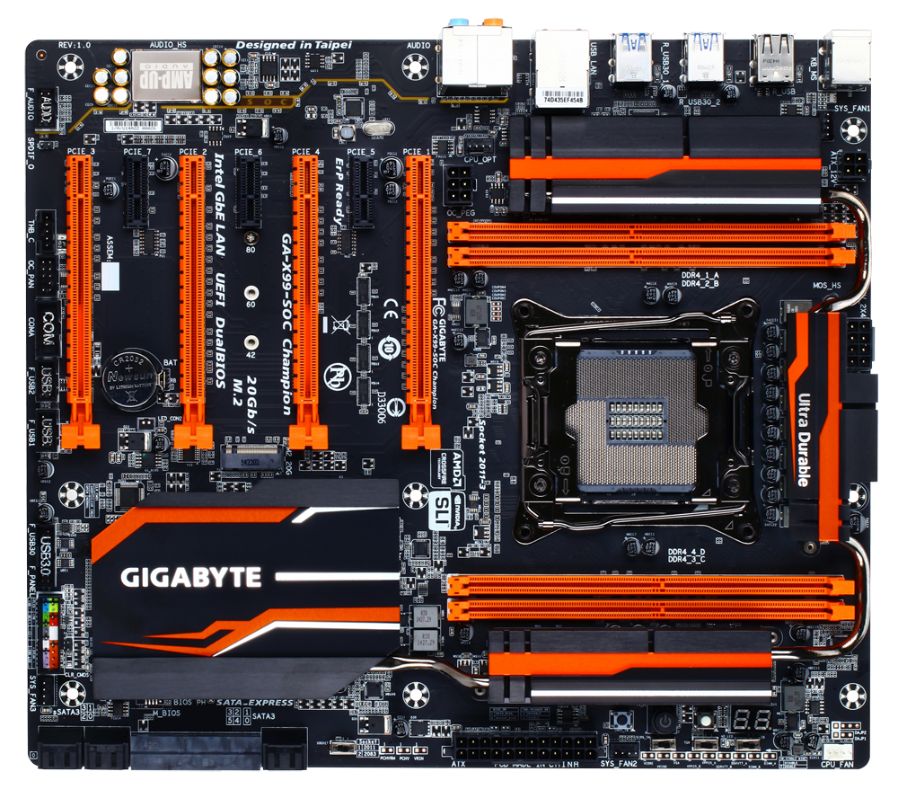 The X99 SOC Champion mainboard from Gigabyte also sports four PCI Express x16 slots for 4-way multi-GPU graphics sub-systems, M.2 slot for SSDs with up to 20Gb/s of bandwidth as well as SATA Express port with 10Gb/s bandwidth.