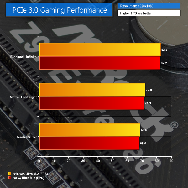 Going from a PCIe 3.0 x16 link to an x8 connection does have a slight impact on performance, but the reduced frame rate numbers are largely negligible.