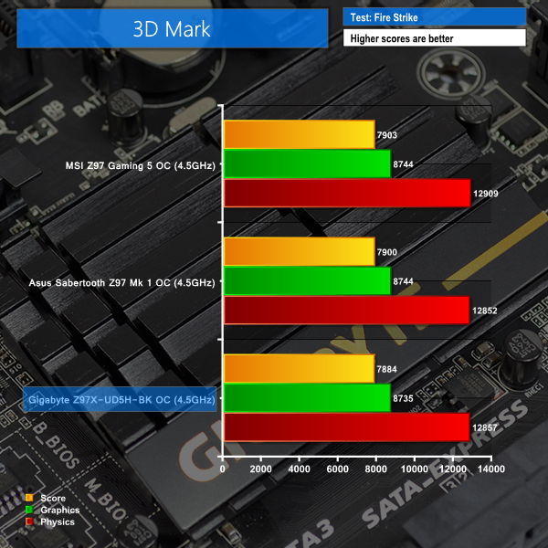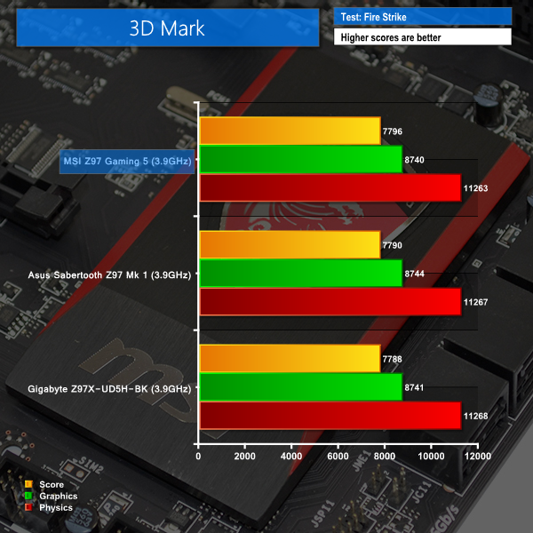 MSI's Z97 Gaming 5 delivers a solid set of system-related test results. The Z97 Gaming 5's performance in the game-simulating 3DMark benchmark is marginally higher than that of the comparison boards.