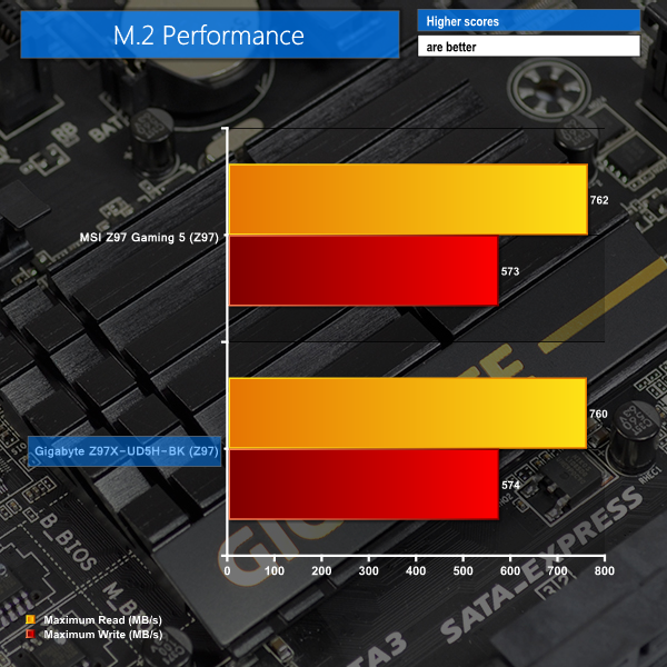 Performance of the chipset-fed M.2 PCIe 2.0 x2 connector is strong. The Z97 Gaming 5 had no problem taking Plextor's fast M6e SSD to its maximum speeds.