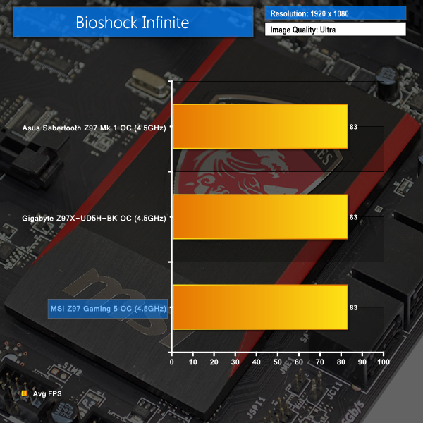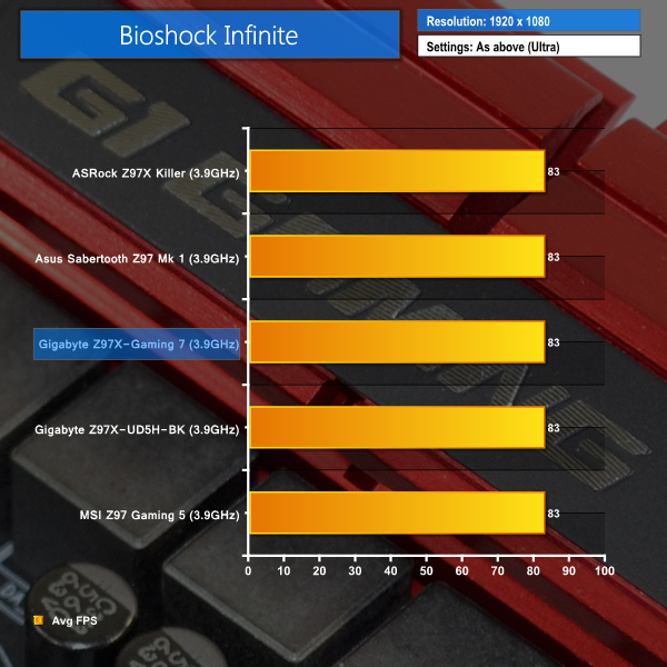 Gaming performance shows no variation between each motherboard using our Bioshock Infinite benchmark.