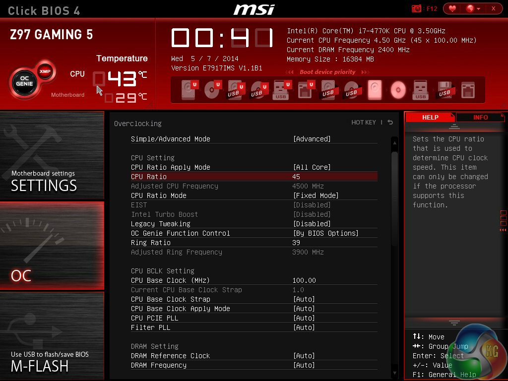 Despite having some irritating layout styles, overclocking a processor via MSI's UEFI is incredibly easy. We simply increased the CPU ratio, opted for a fixed multiplier mode, and tweaked some frequency settings.