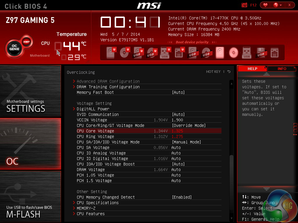 To test the MSI Z97 Gaming 5 motherboard’s CPU overclocking potential, we first increased the CPU VCore to 1.325V, Ring voltage to 1.275V, and CPU Input Voltage to 1.900V. The ‘CPU Ring' ratio was set to 39x. These settings represent levels which we would consider safe for 24/7 usage with a mid-range, or better, CPU cooler.