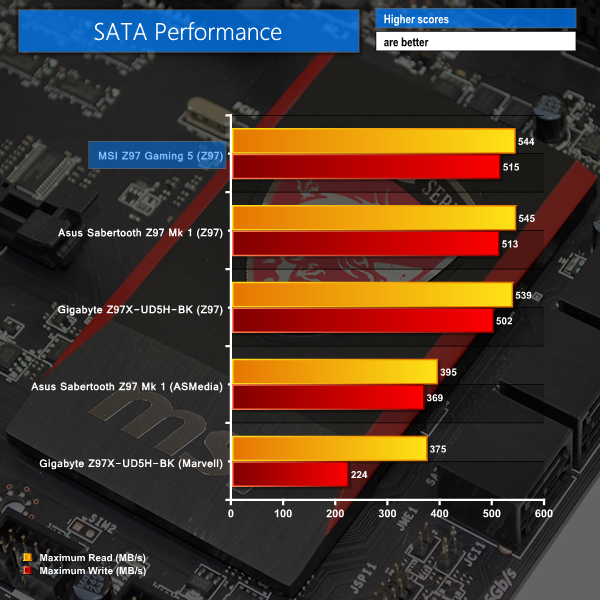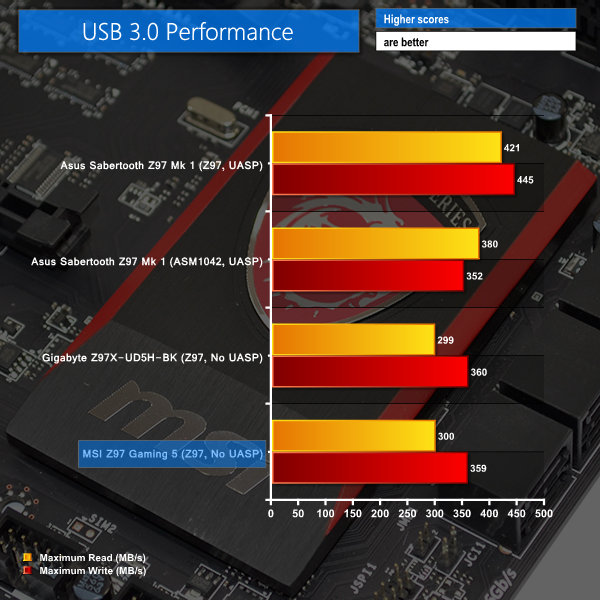Unlike the Gigabyte and Asus boards that also appeal to professional buyers, it is not likely for a user purchasing MSI's budget Z97 Gaming 5 motherboard to be connecting a fast SSD to the USB 3.0 ports. Transfer rates of over 300MBps are perfectly adequate for even the speediest of portable HDDs.