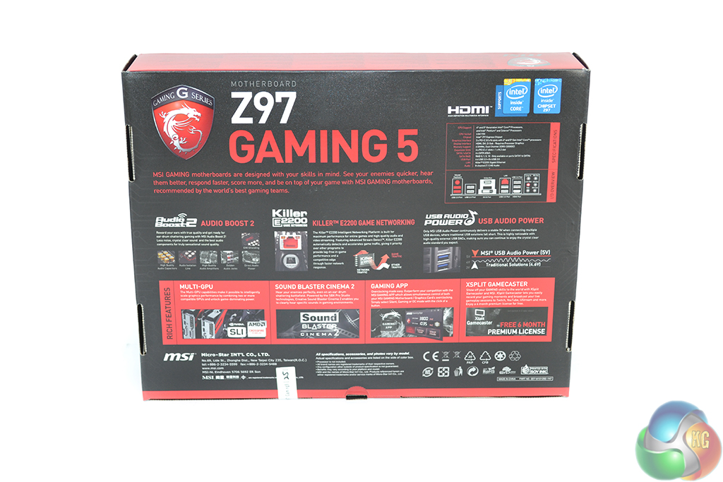 Commonplace for its Gaming series components, MSI ships the Z97 Gaming 5 motherboard in red and black packaging that sports the dragon logo. Key features and specifications are outlined on the packaging's rear side.