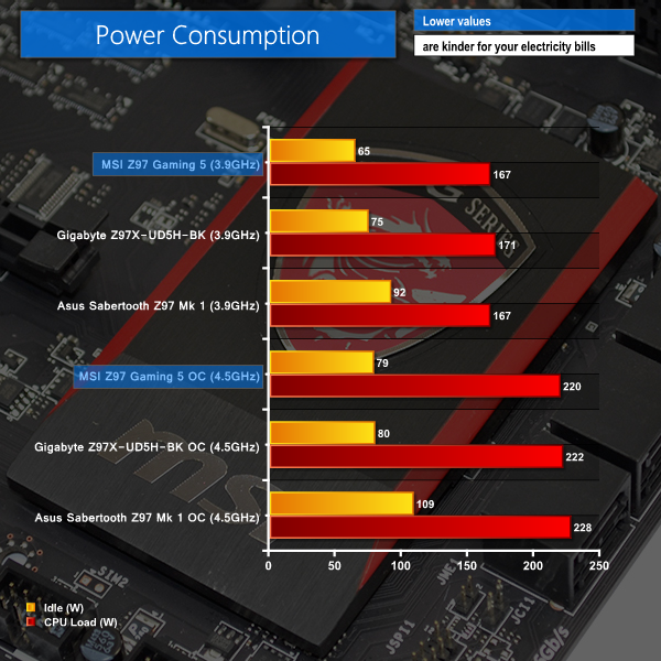 Power consumption is a strength for the low-cost MSI gaming motherboard. Relying largely upon features already incorporated onto the chipset, not provided via add-on controllers, the Z97 Gaming 5 delivers low idle power consumption.