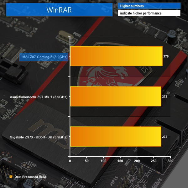 In our set 30-second WinRAR benchmark period, MSI's motherboard managed to convert an incrementally higher amount of data than competing Asus and Gigabyte boards.