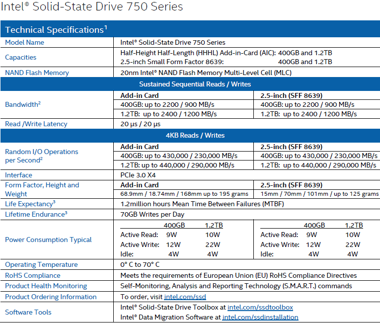 Thanks to advanced controller and high-speed NAND, Intel’s 750-series solid-state drives can deliver truly stunning performance for consumer-grade SSDs. Intel declares sequential read/write speeds up to 2.20/0.9 GB/s for the 400GB version and up to 2.40/1.2 GB/s for the 1.2TB flavour. Thanks to support of the NVM Express (NVMe) protocol, the new SSDs should deliver considerably higher performance in real-world applications than the drives with similar interfaces, but which rely on the outdated AHCI standard. Still, in many workloads that require intensive writes, Intel’s 750-series SSDs will be behind a number of other high-end SSDs available today.