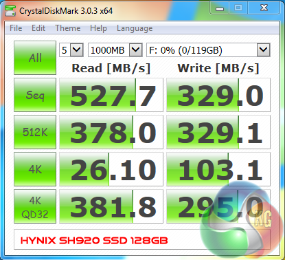 Crystalmark is a useful benchmark to measure theoretical performance levels of hard drives and SSD’s. We are using V3.0.3.