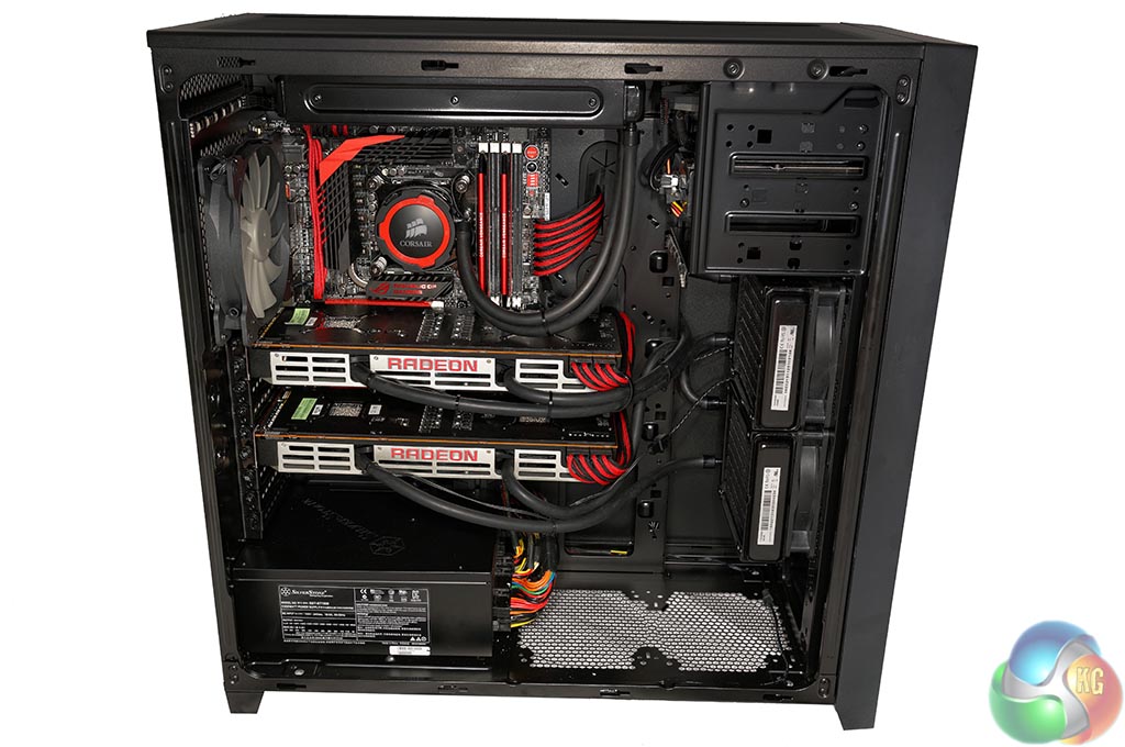 Each R9 295X2 is cooled by a 120mm radiator and we can see they are both fitted at the front of the chassis, with fans positioned to intake. It is worth pointing out that the liquid inside the R9 295X2 radiators will get warm under load, so the intake air won't be entirely cool by the time it leaves the radiator to hit the rest of the system components behind it. Not ideal – but as the 4770k is cooled by the Corsair H105, fitted to the top of the Obsidian 750D – OCUK were out of options.
