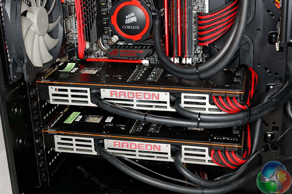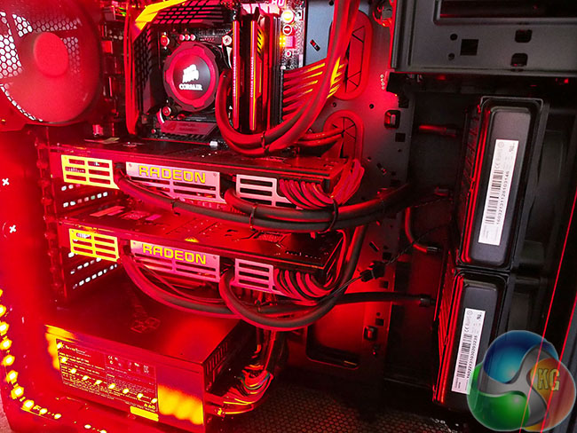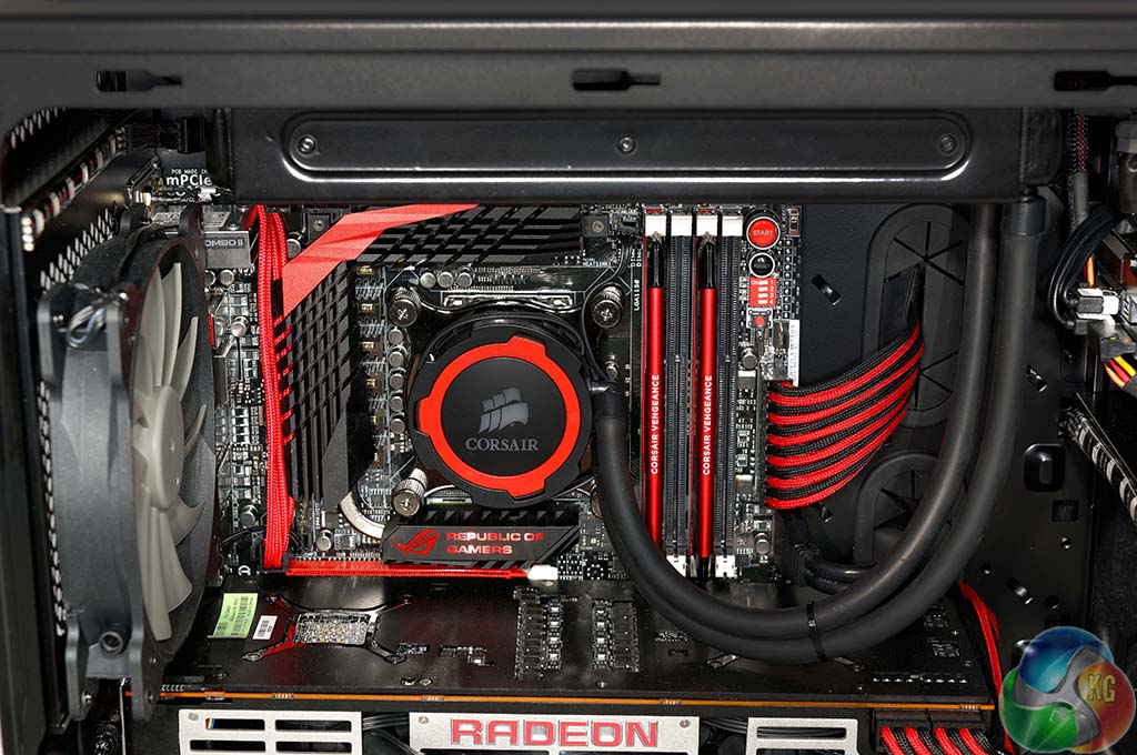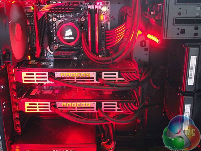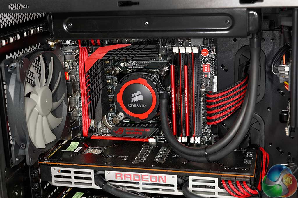 The whole system is coordinated in red and black and looks great – with matching Corsair Vengeance Pro memory. The silver accenting on the R9 295X2 heatsinks give the build a little ‘depth' too.