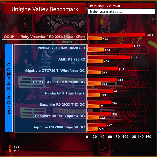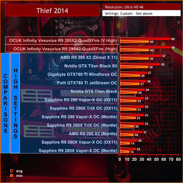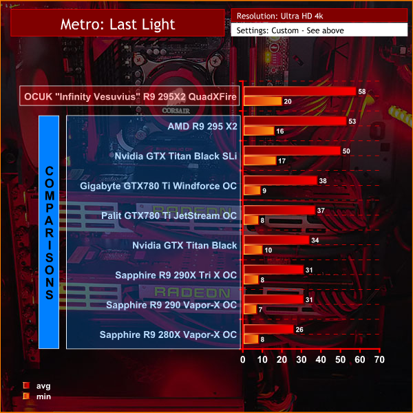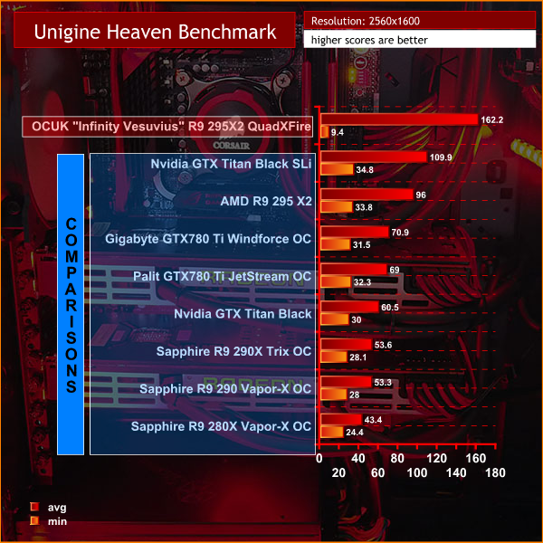 It is very important to point out that these results are NOT directly comparable – but are valuable as a reference point for the overall gaming performance of the OverclockersUK “Infinity Vesuvius” R9 295X2 QuadXFire System. We are taking the results using this system from our latest graphics card review which was published on the 15th of April. These are marked in transparent blue throughout the graphs in the review.