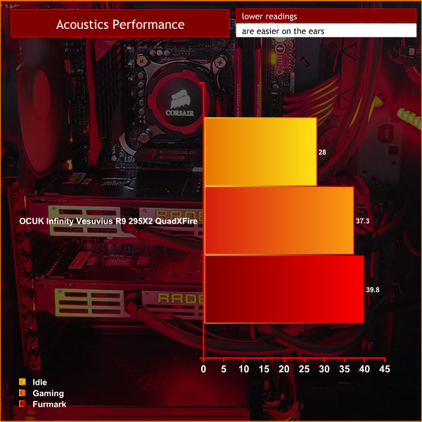The system is very quiet when idle, but becomes clearly audible under gaming load. Surprisingly it isn't as loud as I had initially considered it might be. Overclockers UK have spaced the R9 295X2 cards apart to allow for airflow between the cards, which helps a little.
