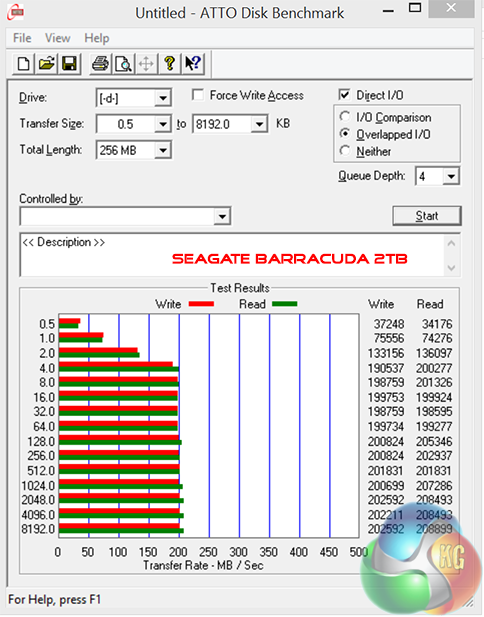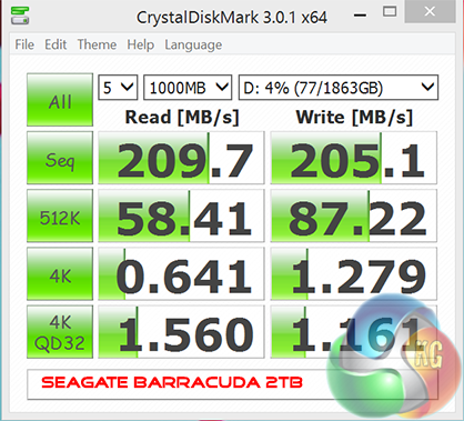 The Samsung 840 EVO Solid State Drive performs exceptionally well, hitting around 540 MB/s and 522 MB/s in the sequential read and write test, respectively. The Seagate Barracuda 2TB is as fast as you would expect from a mechanical drive hitting between 200 and 210 MB/s.