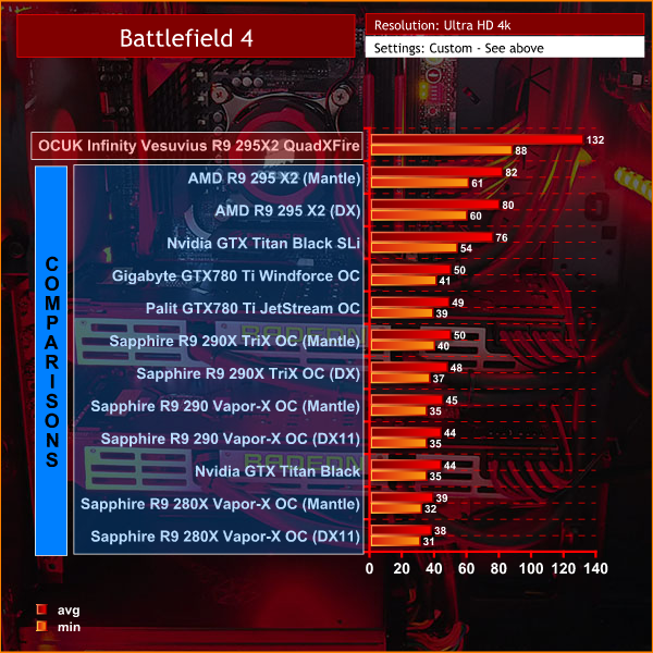 Battlefield 4 can bring some systems to their knees at high image quality settings. This may be hard to believe when you see the frame rate produced by the dual R9 295X2 cards in the OverclockersUK “Infinity Vesuvius” R9 295X2 QuadXFire System!