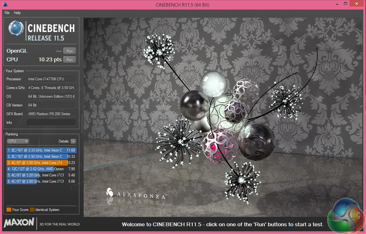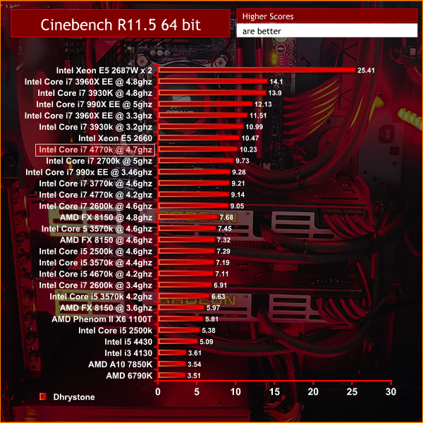 The system we reviewed today ships with a 4.7ghz clock speed, although due to the heat and variance when overclocking a Haswell processor, OCUK do mention ‘overclocked to at least 4.6GHz' on the “Infinity Vesuvius” system page. As a side note, KitGuru's three 4770k engineering samples are relatively poor overclockers, hitting between 4.5ghz and 4.6ghz – so we can understand why OCUK list this.