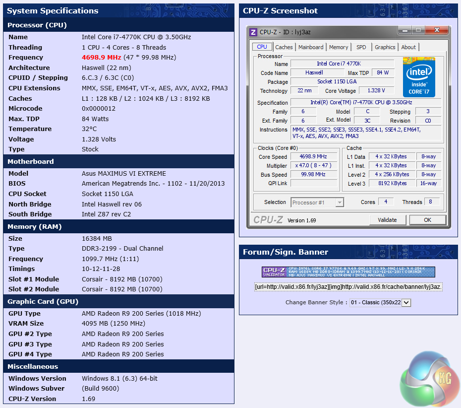 The OverclockersUK “Infinity Vesuvius” R9 295X2 QuadXFire System is based around an overclocked Core i7 4770k processor, running at 4.7ghz.