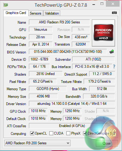 GPUZ shows the R9 295X2 graphics cards successfully running in Quad Crossfire – the latest 14.4 beta driver from AMD was sent over for this review.