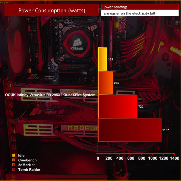 While the “Infinity Vesuvius” has broken a series of performance benchmarks due to the might of combined R9 295 X2 graphics cards, it also breaks the record for the most power used when gaming. At Ultra HD 4K, when playing Tomb Raider at the ‘Ultimate' graphics setting – this system demands a staggering 1,157 watts of power.