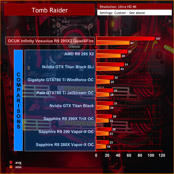 Tomb Raider is a fantastic game, both in terms of visual quality and gameplay. We had a good experience with a single R9 295 X2, however the OverclockersUK “Infinity Vesuvius” R9 295X2 QuadXFire system pushes the frame rates into a completely new stratosphere. If you like to maintain a constant 60 frames per second at Ultra HD 4k with maximum image quality settings then this is the only system we have reviewed that can do it.
