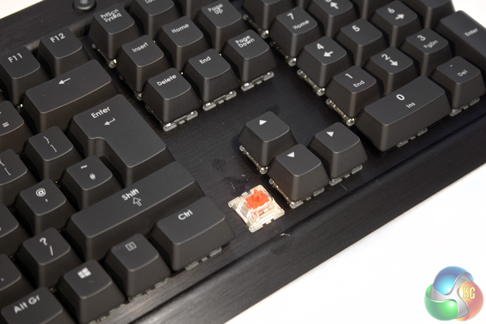 However this is no mere clear-plastic Cherry MX switch, but something that was custom designed in a cooperation between Cherry MX and Corsair. These are unique switches not to be found anywhere else, with slightly altered LED mounting for better lighting options and improved LED life span. It is part of the reason this board is so expensive (£140).